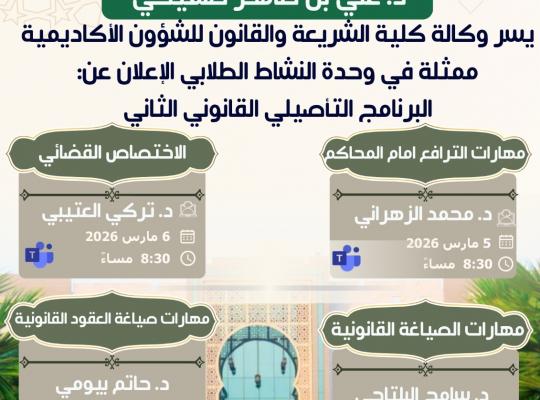 نفذت كلية الشريعة والقانون دورة تدريبية بعنوان “الاختصاص القضائي”، ضمن البرنامج التأصيلي القانوني الثاني، بهدف تعزيز المعرفة القانونية لدى الطلبة. وتناولت الدورة مفهوم الاختصاص القضائي وأنواعه، والقواعد المنظمة له في الأنظمة العدلية، إلى جانب استعراض