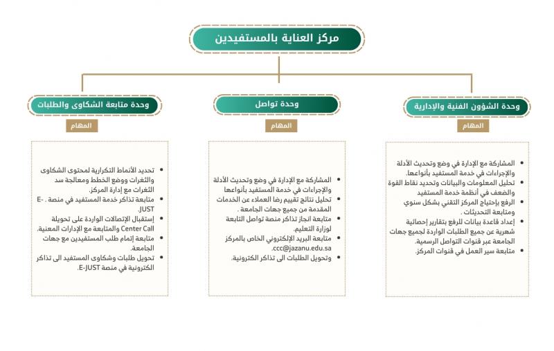 الصورة مدير مركز العناية بالمستفيدين نوف محمد قاسم عسيس تحويلة : 5559 البريد الالكتروني : nassis@jazanu.edu.sa ---------------------- البريد الإلكتروني لمركز العناية بالمستفيدين : ccc@jazanu.edu.sa عن الإدارة كلمة المدير العام أقسام الإدارة العامة الهيكل التنظيمي الجهات التابعة لها المتحدث الرسمي للجامعة إدارة الاتصال المؤسسي إدارة الإعلام إدارة العلاقات العامة والمراسم مركز العناية بالمستفيدين أدلة ونماذج الإدارة أصداء الجامعة التواصل مع الإدارة العامة للاتصال والإعلام نبذة عن المركز يهدف إلى تحسين تجربة المستفيدين من خدمات الجامعة، وتعزيز قنوات التواصل معهم، لضمان تحقيق أعلى مستويات الرضا والجودة. الصورة أضغط هنـــــــــــــــــــــــــــــا الصورة الصورة عائشة علي مباركي وحدة الشؤون الإدارية والفنية التحويلة : 3352 البريد الالكتروني : aambarki@jazanu.edu.sa الصورة الصورة منى موسى عقيلي وحدة متابعة الطلبات والشكاوى التحويلة : 3983 البريد الالكتروني : [email protected] الصورة الصورة أنيسة حسين سفياني وحدة تواصل التحويلة : 3171 البريد الالكتروني : asofiani@jazanu.edu.sa نسعد بإستقبال اسئلتكم واستفساراتكم عبر خدمة العناية بالمستفيد (إعــتــمــد) : اضغط هنــــــــــــــــــــــــــــــــــــــا