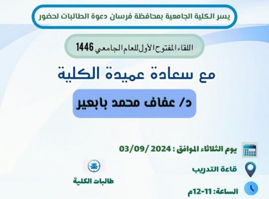 يسعدنا الانضمام لحضور اللقاء المفتوح الأول للطالبات للعام الجامعي ١٤٤٦هـ