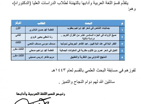 يتقدم القسم بخالص التهنئة والتبريكات لطلاب الدراسات العليا (الدكتوراه) لفوزهم في مسابقة البحث العلمي في القسم لعام ١٤٤٣ه، وهم: المركز الأول/ فاطمة بنت محمد الناشري في بحثها الموسوم ب: (جماليات التناص في شعر محمد إبراهيم يعقوب) المركز الثاني/ رنا بنت