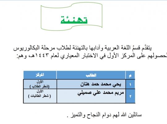 يتقدم قسم اللعة العربية وآدابها بخالص التهنئة لطلاب مرحلة البكالوريوس لحصولهم على المركز الأول في الاختبار المعياري لعام ١٤٤٣ه متمنيين لهم دوام التوفيق والنجاح والتميز.