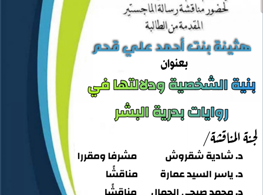 يدعوكم قسم اللغة العربية وآدابها لحضور مناقشة رسالة الماجستير في الدراسات الأدبية والنقدية والتي تقدمت بها الطالبة/ هثينة بنت أحمد علي قحم وعنوانها/ "بنية الشخصية ودلالتها في روايات بدرية البشر" وتتكون لجنة المناقشة والحكم على الرسالة من: د. شادية