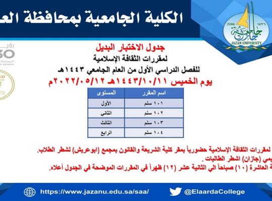 جدول الإختبار البديل لمقررات ( الثقافة الإسلامية )