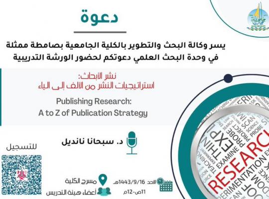 تتشرف الكلية الجامعية بصامطة بدعوتكم لحضور ورشة تدريبية بعنوان "نشر الأبحاث: استراتيجيات النشر من الألف إلى الياء"