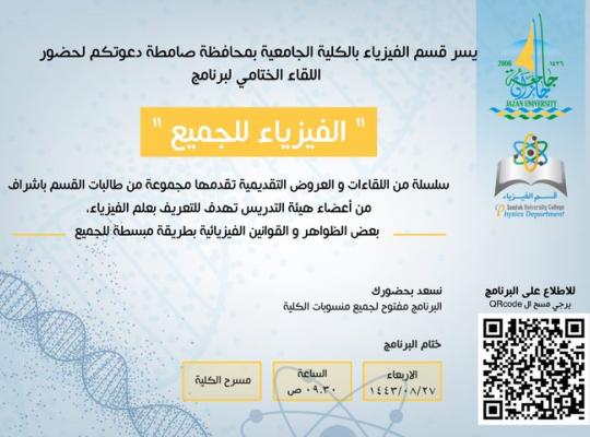 يسعد قسم الفيزياء بالكلية الجامعية بصامطة بدعوتكم لحضور اللقاء الختامي لبرنامج "الفيزياء للجميع".