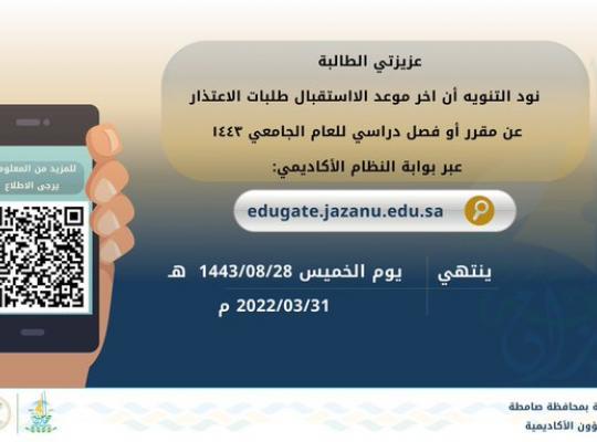 موعد إستقبال طلبات الإعتذار عن مقرر أو فصل دراسي بالكلية الجامعية بصامطة