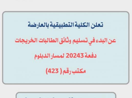 تعلن الكلية التطبقيه بالعارضة عن البداء بتسليم الوثائق للطلبات الخريجات دفعة (20243) مسار الدبلوم