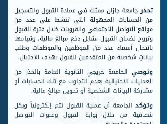 جامعة جازان تحذر من الحسابات المجهولة والاحتيالية