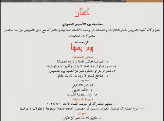 بمناسبة يوم التأسيس السعودي تعلن وكالة الكلية بشطر الطالبات والممثلة في وحدة الانشطة الطلابية وبالشراكة مع نادي التمريض عن بدء استقبال مشاركات الطالبات في مسابقة ( يوم بدينا ) واخر موعد لتسليم المشاركة هو يوم الاحد الموافق 2022/02/20 م