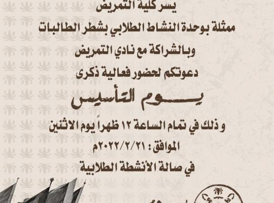 يسر كلية التمريض ممثلة بوحدة النشاط الطلابي بشطر الطالبات وبالشراكة مع نادي التمريض دعوتكم لحضور فعالية ذكرى يوم التأسيس وذلك يوم الاثنين الموافق 2022/02/21 م في صالة الانشطة الطلابية