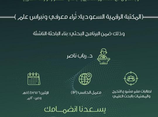تتشرف الكلية الجامعية بصامطة بدعوتكم لحضور ورشة تدريبية بعنوان "المكتبة الرقمية السعودية: ثراء معرفي و نبراس علم"