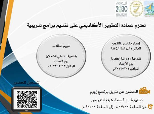تعلن عمادة التطوير الاكاديمي عن تقديم دورات تدريبية ( عن بعد ) لأعضاء هيئة التدريس بالجامعة