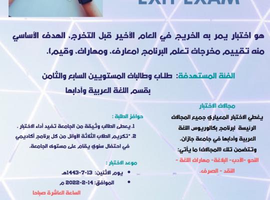 يعلن قسم اللغة العربية عن إقامة اختبار معياري للطلاب والطالبات المتوقع تخرجهم بنهاية هذا العام الجامعي ١٤٤٣ه وذلك يوم الاثنين ١٤٤٣/٧/١٣ه الموافق ٢٠٢٢/٢/١٤م الساعة العاشرة صباحا، وسيتم الإعلان لاحقا عن الدورة التعريفية للاختبار بإذن الله.