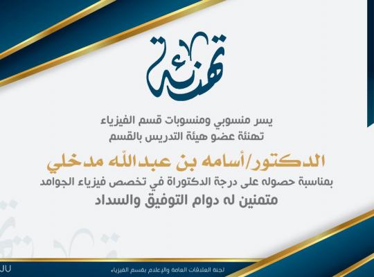 يسر منسوبي و منسوبات القسم تهنئة د. اسامة بن عبدالله مدخلي بمناسبة حصولة علي درجة الدكتوارة في تخصص فيزياء الجوامد سائلين المولى عز وجل لها دوام التوفيق والسداد.