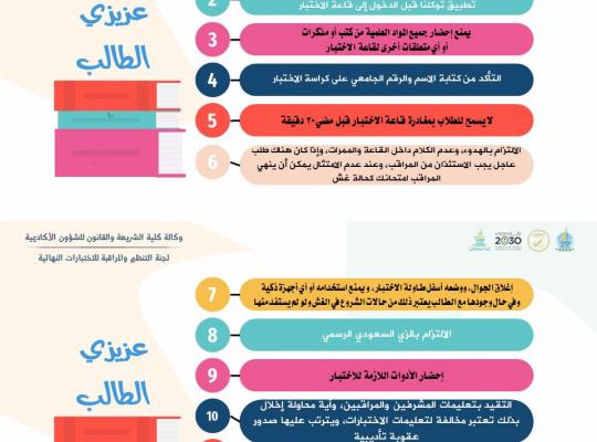 ترحب كلية الشريعة والقانون بطلابها وطالباتها في الاختبارات النهائية للفصل الدراسي الثالث (20243) ابتداء من تاريخ 18/11/1445 نصائح وقت المذاكره