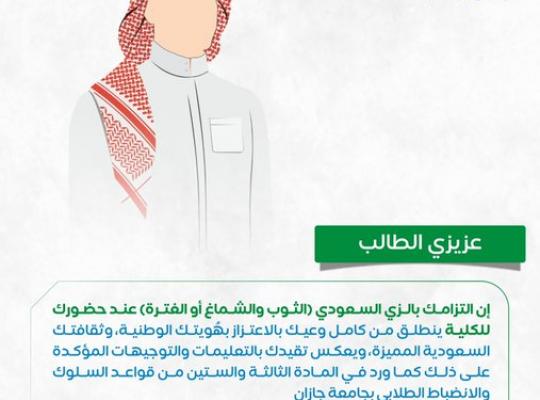 @jazanu_CSL عزيزي الطالب إلتزامك بالزي السعودي عند حضورك للكلية من وعيك واعتزازك بالهوية الوطنية..