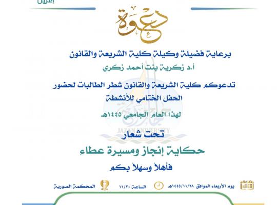 دعوة برعاية فضيلة وكيلة كلية الشريعة والقانون تدعوكم كلية الشريعة والقانون شطر الطالبات لحضور الحفل الختامي للأنشطة لهذا العام الجامعي ١٤٤٥هـ تحت شعار حكاية إنجاز ومسيرة عطاء