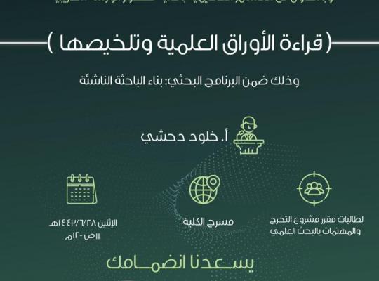 ضمن البرنامج البحثي(الباحثة الناشئة) تقيم الكلية الجامعية بصامطة دورة تدريبية بعنوان "قراءة الأوراق العلمية و تلخيصها"