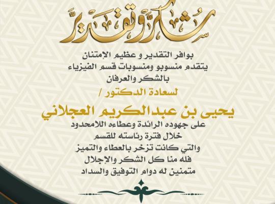 يتقدم منسوبو و منسوبات القسم بخالص الشكر والتقدير لسعادة الدكتور يحيي العجلاني علي جهوده الرائده وعطائه الامحدود خلال فترة رئاسته للقسم متمنين لسعادته دوام التوفيق والنجاح .