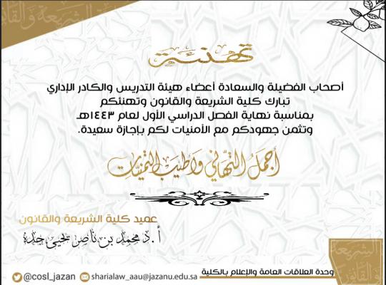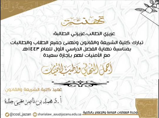 تبارك كلية الشريعة والقانون وتهنئ جميع الطلاب والطالبات