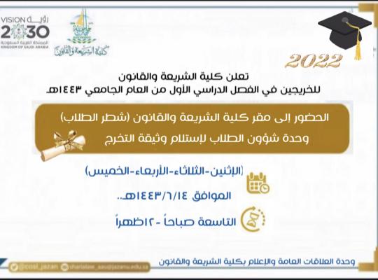 تعلن كلية الشريعة والقانون للخريجين في الفصل الدراسي الأول من العام الجامعي1443هـ