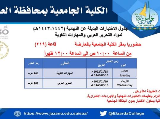 جدول الاختبارات البديلة عن النهائية (لمواد التحرير العربي - والمهارات اللغوية )