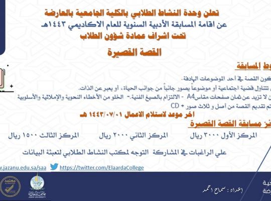 برعاية عمادة شؤون الطلاب يسر وحدة شؤون الطالبات يسر وحدة النشاط الطلابي بالكلية الجامعية بأبي عريش أن تعلن لطالباتها عن المسابقة الأدبية السنوية للعام الأكاديمي 1443هـ وذلك في مجال الشعر والقصة القصيرة، فعلى الطالبات الراغبات في المشاركة في المسابقة