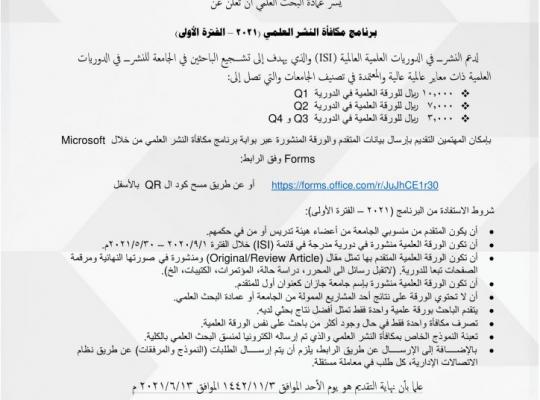 تعلن عمادة البحث العلمي عن بدء استقبال طلبات التقديم على البرنامج البحثي (واعد) لأعضاء هيئة التدريس السعوديين الجدد بالجامعة في مختلف التخصصات وفق الشروط أدناه، علماً بأن اخر موعد لاستقبال الطلبات يوم الخميس 1442/7/20هـ الموافق 4 مارس 2021م. الشروط