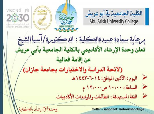تدعوكم وحدة الإرشاد الأكاديمي لحضور فعاليات الأسبوع الإرشادي 20222برعاية سعاد عميدة الكلية د. آسيا الشيخ لائحة الدراسة والاختبارات بجامعة جازان ليوم الاثنين 14-6-1443هـ الفئة المستهدفة ١. الطالبات المستجدات ممن كانوا معتذرات او مؤجلات ٢. جميع
