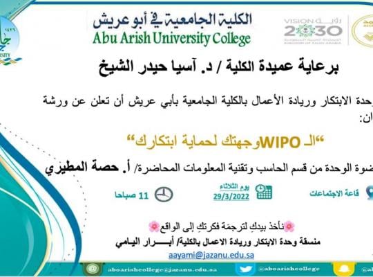 نظمت وحدة الابتكار وريادة الأعمال ورشة عمل بعنوان ( الـ WIPO وجهتك لحماية ابتكارك) قدمتها المحاضرة بقسم تقنية وأمن المعلومات م. حصة المطيري وذلك يوم الثلاثاء الموافق29 /3/2022م بقاعة الاجتماعات بالكلية. وقد اشتملت على عدة محاور وهي : - تعريف حقوق