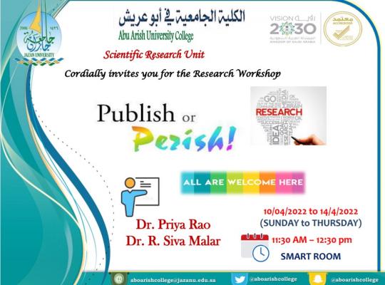 نظمت وحدة البحث العلمي بالكلية الجامعية بأبو عريش ورشة عمل بعنوان "Publish or Pezish" لأعضاء هيئة التدريس، قدمتها منسقة وحدة البحث العلمي د. بريا راو وأعضاء الوحدة د. سيفا ميلر و م. نسرين عوض لمدة خمس أيام وذلك ابتداءً من يوم الأحد الى يوم الخميس