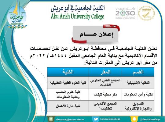 إعلان هام لجميع الطالبات تعلن الكلية الجامعية في محافظة أبوعريش عن نقل تخصصات الأقسام الأكاديمية مع بداية العام الجامعي المقبل 1444هـ / 2022م