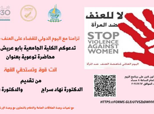 نفذت وحدة العلاقات العامة والاعلام بالكلية فعالية اليوم الدولي للقضاء على العنف ضد المرأة في يوم الأحد الموافق 12/12/2021 أقامت الدكتورة / نهاد سراج رئيسة وحدة الإرشاد الأكاديمي بالتعاون مع الدكتورة / سلوى آدم عضو هيئة التدريس بقسم التسويق والتجارة