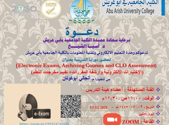 نظمت وحدة التعليم الإلكتروني وتقنيه المعلومات بالكلية الجامعية بأبو عريش تحت رعاية عميدة الكلية الدكتورة/ آسيا الشيخ ورشة عمل حول "الاختبارات الإلكترونية ودورات الأرشفة وتقييم CLO" لأعضاء هيئة التدريس. أقيمت الورشة في 13.12.2021 من قبل المحاضرة/