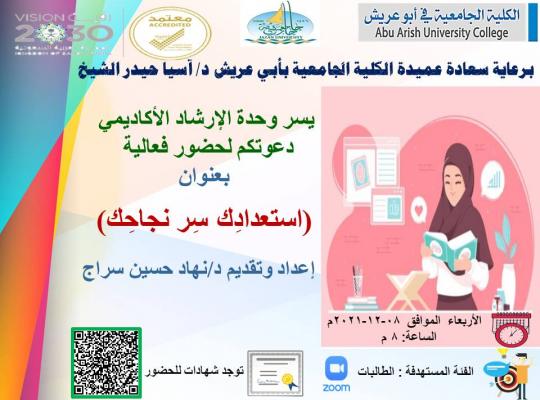 نظمت الكلية الجامعية بأبي عريش برعاية سعادة عميدة الكلية د. آسيا علي حيدر الشيخ ممثلة في وحدة الإرشاد الطلابي برنامجها الإرشادي بعنوان (استعدادك سر نجاحك) قدمته منسقة وحدة الإرشاد الطلابي د. نهاد سراج لطالبات الكلية يوم الأربعاء الموافق 4 جمادى