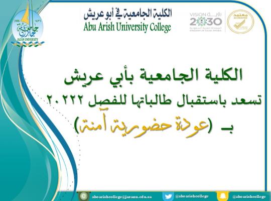 الكلية الجامعية بأبي عريش تسعد باستقبال طالباتها للفصل 20222 بـــــــــ (عودة حضورية آمنة) برعاية عميدة الكلية الدكتورة / آسيا علي الشيخ استقبلت الكلية الجامعية بأبي عريش طالباتها بحفاوة وبدأت الدراسة من اليوم الأول الأحد 13-6-1443هـ حضوريًا بمقر