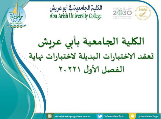 الكلية الجامعية بأبي عريش تعقد اختبارات نهاية الفصل الأول البديلة 20221 بدأت الكلية الجامعية بأبي عريش بعقد اختبارات نهاية الفصل الأول البديلة 20221 للطالبات الغائبات بأعذار مقبولة مع بداية الفصل الثاني في مقر الكلية مع الحرص على الالتزام بتطبيق