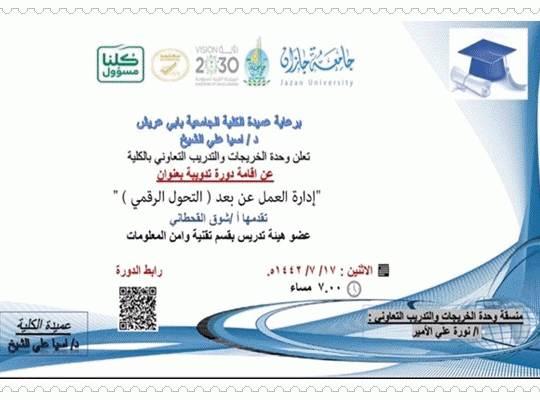نفذت وحدة الخريجات والتدريب بالكلية فعالية بعنوان (ادارة العمل عن بعد التحول الرقمي ) وذلك يوم الاثنين الموافق 1442/07/17 هـ بحضور عميدة الكلية د.آسيا علي حيدر الشيخ قدمتها أ/شوق القحطاني عضو هيئة التدريس بقسم تقنية وامن المعلومات وبإشراف وتنسيق من