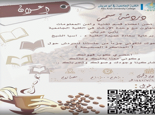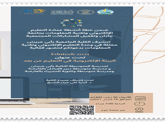 ضمن خطة أنشطة عمادة التعليم الإلكتروني وتقنية المعلومات بجامعة جازان وتفعيل المشاركات المجتمعية في التعليم الإلكتروني، وتحت إشراف عميدة الكلية الجامعية بأبي عريش د/ آسيا الشيخ، نفذت وحدة التعليم الإلكتروني وتقنية المعلومات بالكلية يوم الأربعاء