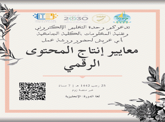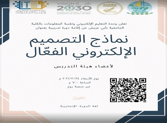 امتدادًا لسلسة الدورات التدريبية ضمن مبادرة عمادة التعليم الإلكتروني وتقنية المعلومات بجامعة جازان لتنمية قدرات أعضاء هيئة التدريس بالجامعة في التعليم الإلكتروني، وتحت إشراف عميدة الكلية الجامعية بأبي عريش د. آسيا علي الشيخ، نفذت وحدة التعليم