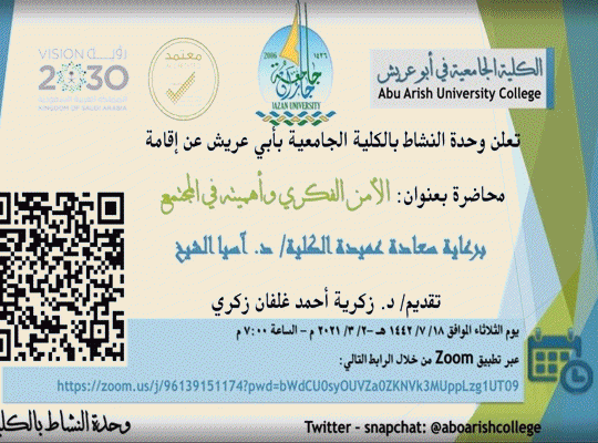 نظمت وحدة النشاط الطلابي بالكلية و تحت إشراف عميدة الكلية الجامعية بأبي عريش د. آسيا علي حيدر الشيخ دورة تدريبية بعنوان(الأمن الفكري وأهميتة في المجتمع) وذلك يوم الثلاثاء الموافق 1442/07/18 هـ من الساعة 7 وحتى الساعة 9 مساءً عبر منصة زوم، بحضور عدد