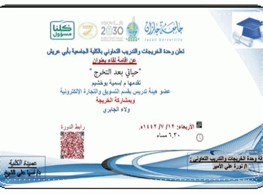 نفذت وحدة الخريجات والتدريب التعاوني بالكلية فعالية بعنوان (حياتي بعد التخرج) وذلك يوم الأربعاء 1442/7/12هـ. بحضور عميدة الكلية د. آسيا علي الشيخ ووكيلة الكلية للشؤون الأكاديمية د. الشيماء حمودة قدمتها م. سمية بوخشيم المحاضرة (بقسم التسويق والتجارة