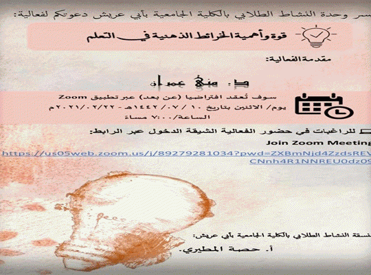 نظمت وحدة النشاط الطلابي بالكلية و تحت إشراف عميدة الكلية الجامعية بأبي عريش الدكتورة / آسيا علي حيدر الشيخ دورة تدريبية بعنوان( قوة وأهمية الخرائط الذهنية) وذلك يوم الاثنين الموافق 1442/07/10 هـ من الساعة 7 مساءً وحتى الساعة 8 مساءً عبر منصة زوم