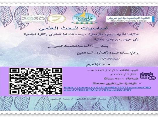 نظمت وحدة النشاط الطلابي بالكلية و تحت إشراف عميدة الكلية الجامعية بأبي عريش د. آسيا علي حيدر الشيخ دورة تدريبية بعنوان(أساسيات البحث العلمي) وذلك يوم الثلاثاء الموافق 1442/07/11 هـ من الساعة 8 وحتى الساعة 9 مساءً عبر منصة زوم، بحضور عدد من أعضاء