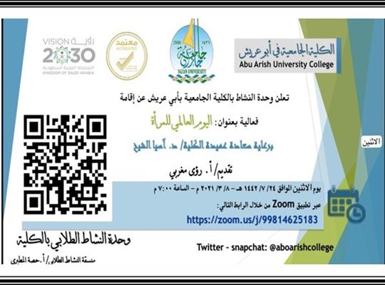 نفذت وحدة النشاط الطلابي بالكلية و تحت إشراف عميدة الكلية الجامعية بأبي عريش د. آسيا علي حيدر الشيخ دورة تدريبية بعنوان(اليوم العالمي للمرأة ) وذلك يوم الاثنين الموافق 1442/07/24 هـ الساعة 7 مساءً عبر منصة زوم، بحضور عدد من أعضاء هيئة التدريس