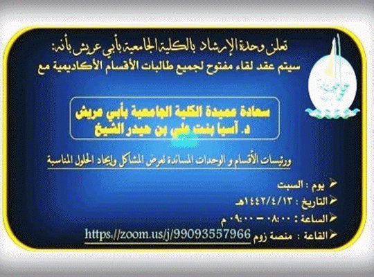 أقامت وحدة الإرشاد بالكلية الجامعية بأبي عريش بتنسيق منسقة الوحدة أ.سهام عايل الأمير لقاءً مفتوحًا لجميع طالبات الكلية مع سعادة عميدة الكلية د. آسيا علي حيدر الشيخ يوم 1442/4/13هـ عبر منصة الـ Zoom بهدف معايشة الأوضاع الأكاديمية للطالبات. وتم فيه