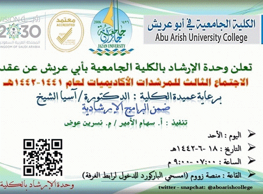 فعّلت وحدة الإرشاد بالكلية الجامعية بأبي عريش برعاية عميدة الكلية د. آسيا علي الشيخ وتنفيذ منسقة الوحدة أ. سهام عايل الأمير الإرشاد المبكر للطالبات المستجدات للفصل الدراسي الثاني 20212 من العام الجامعي 1441-1442هـ قبل بدء الدراسة في الفترة 21-5