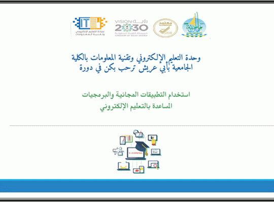 تحت إشراف عميدة الكلية الجامعية بأبي عريش الدكتورة / آسيا علي حيدر الشيخ نفذت وحدة التعليم الإلكتروني بالكلية دورة تدريبية بعنوان " استخدام التطبيقات المجانية والبرامج المساعدة في التعليم الإلكتروني " لأعضاء هيئة التدريس للفصل الدراسي الثاني للعام