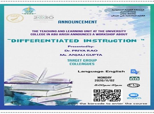 أقامت وحدة التعليم والتعلم بالكلية يوم الاثنين الموافق 2020/11/2م ورشة عمل بعنوان (التعليم المتنوع) عبر برنامج زووم، بحضور عميدة الكلية د. آسيا علي حيدر الشيخ وكيلة الكلية م. نور عبدالرحمن العطاس،استهدفت الورشة اعضاء هيئة التدريس وقدمها كلا من: د