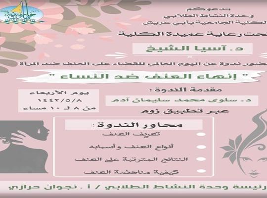 قامت وحدة النشاط بالكلية بتفعيل اليوم العالمي للعنف ضد النساء تحت رعاية عميدة الكلية د. آسيا الشيخ، وبالتعاون مع مقدمة الفعالية د. سلوى آدم وذلك بعقد ملتقى عبر تطبيق الزوم في يوم الأربعاء 8-5-1442هـ في تمام الساعة 8 مساء، واستمر اللقاء حتى الساعة 10